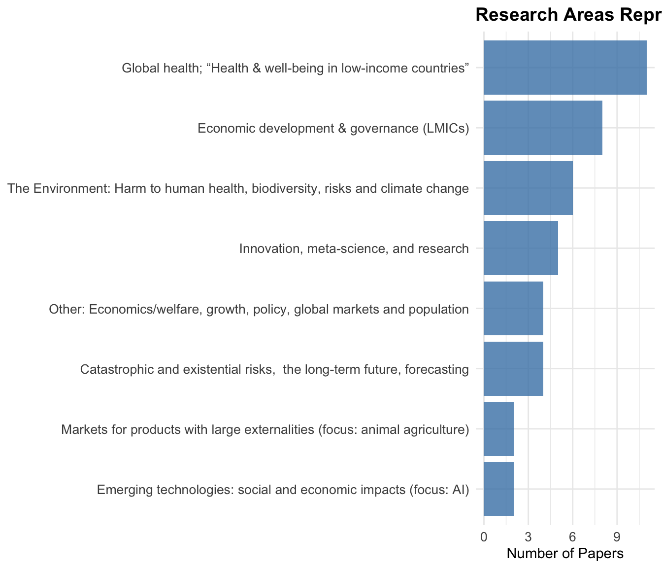 The distribution aligns with The Unjournal’s focus on high-impact research for global priorities. Environmental and health economics dominate—reflecting urgent climate and public health challenges—while democracy, development, and existential risk research receive substantial attention.