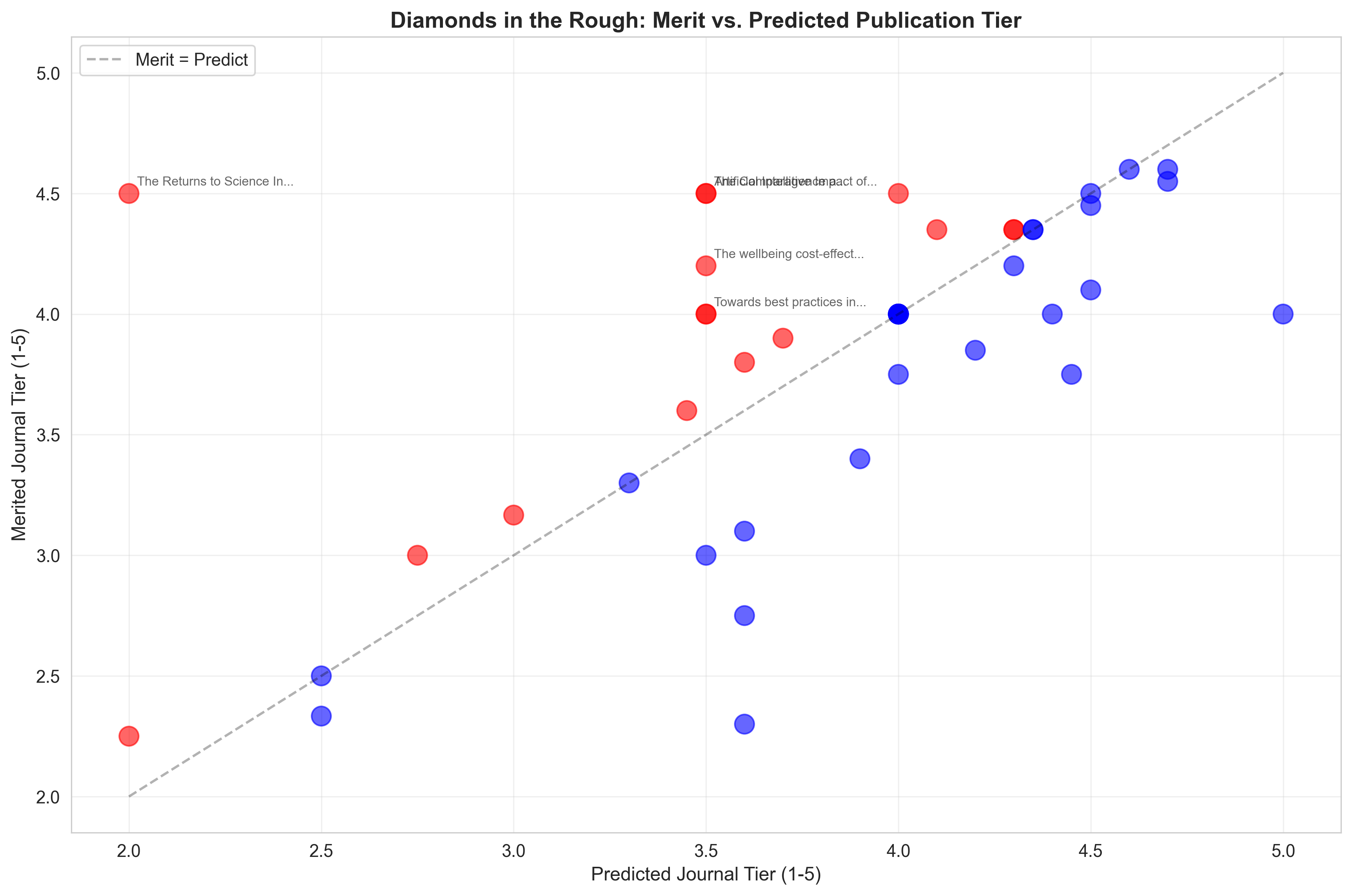 The Returns to Science In the Presence of Technological Risks (Diamond: +2.5) - Merited journal tier: 4.5, Predicted: 2.0 - Largest gap between merit and predicted tier; evaluators saw exceptional methodological quality despite perceived challenges in traditional publication venues