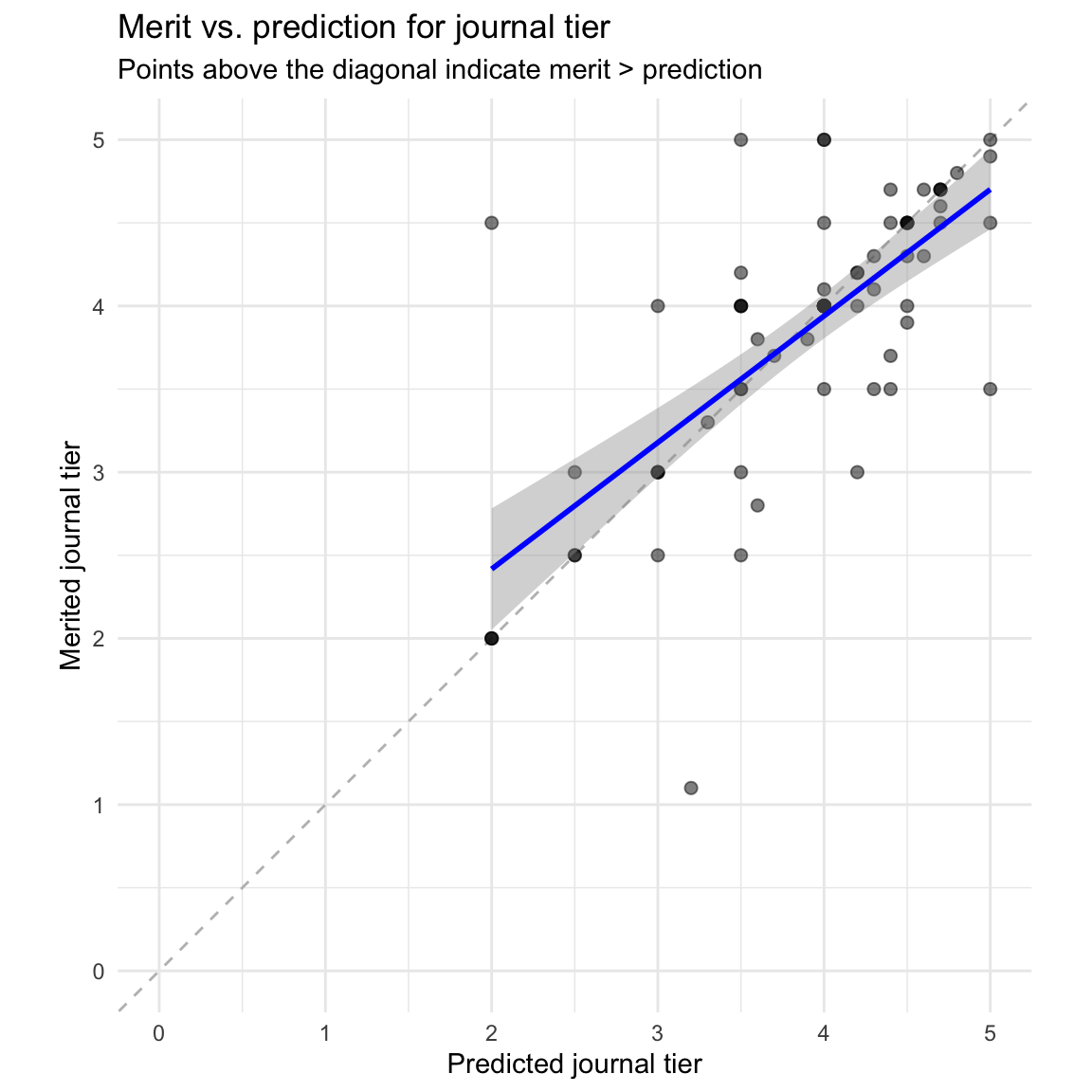 - Mean difference: -0.033 tiers (merit - prediction)