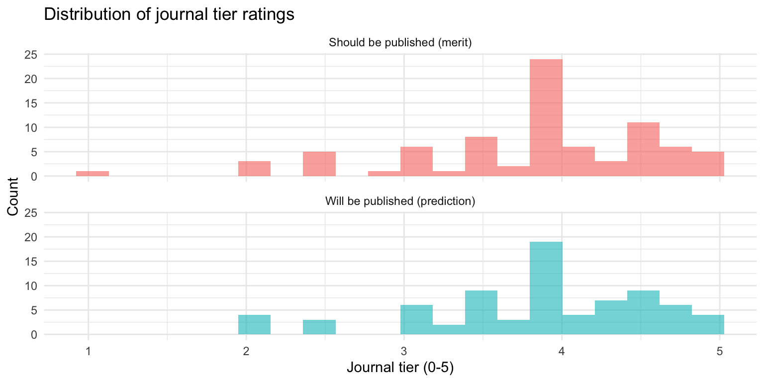 Journal tiers: Evaluators consistently judge papers as meriting higher-tier publication than they predict they will receive. This difference is statistically significant (p < 0.001) with a small to medium effect size. As we observe actual publication outcomes, we’ll be able to assess the accuracy of these predictions.