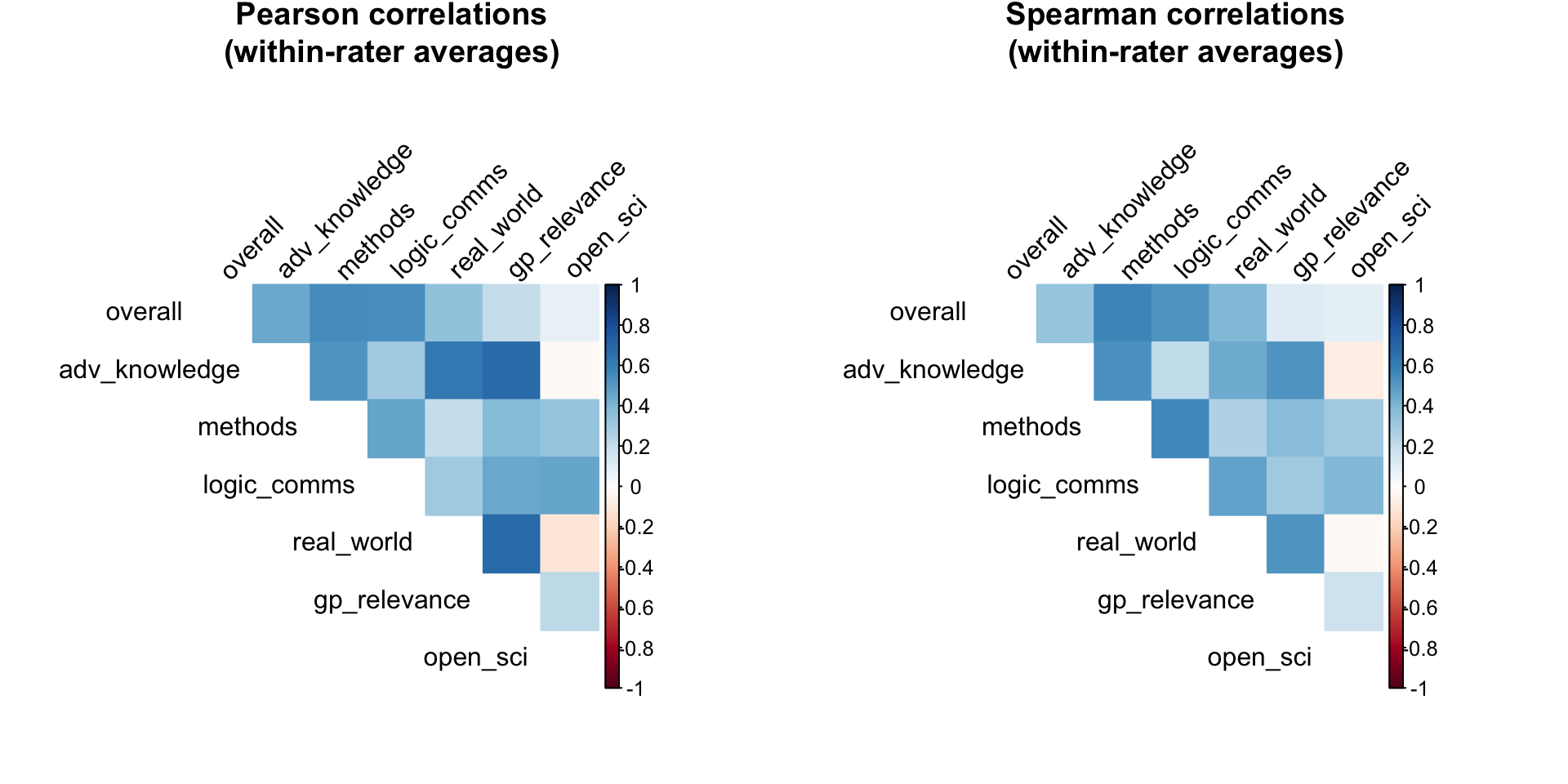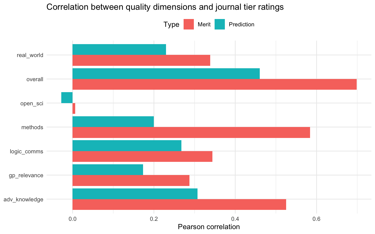This shows which quality dimensions are most strongly associated with evaluators’ judgments about journal tier. Typically, “overall” assessment and “adv_knowledge” show the strongest correlations with both merit and prediction ratings.